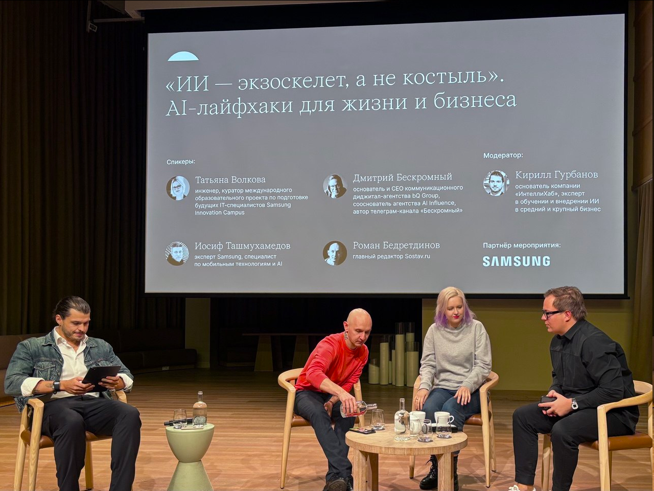 Эксперты, среди которых были основатель «ИнтеллиХаб» Кирилл Гурбанов, CEO bQ Group Дмитрий Бескромный, инженер и куратор образовательной инициативы Samsung Innovation Campus Татьяна Волкова и главный редактор Sostav.ru Роман Бедретдинов, обсудили, как компаниям и сотрудникам адаптироваться к реалиям, где ИИ превращается в такой же привычный инструмент, как Microsoft Office.