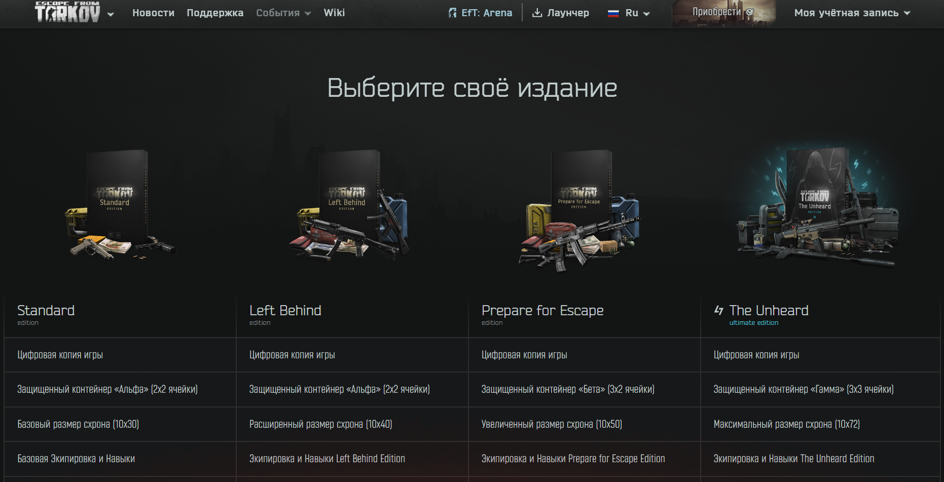 Основной источник дохода Escape From Tarkov — продажа редакций игры с увеличением стартового снаряжения, размера схрона и репутации у торговцев. Издание Standard с базовой экипировкой и навыками в сентябре 2025 года обойдется в 1800 руб., а The Unheard с размером схрона 10х72, экипировкой и навыками The Unheard Edition, повышенным отношением со всеми торговцами в игре и доступом к будущим DLC — уже 8580 с учетом скидки.