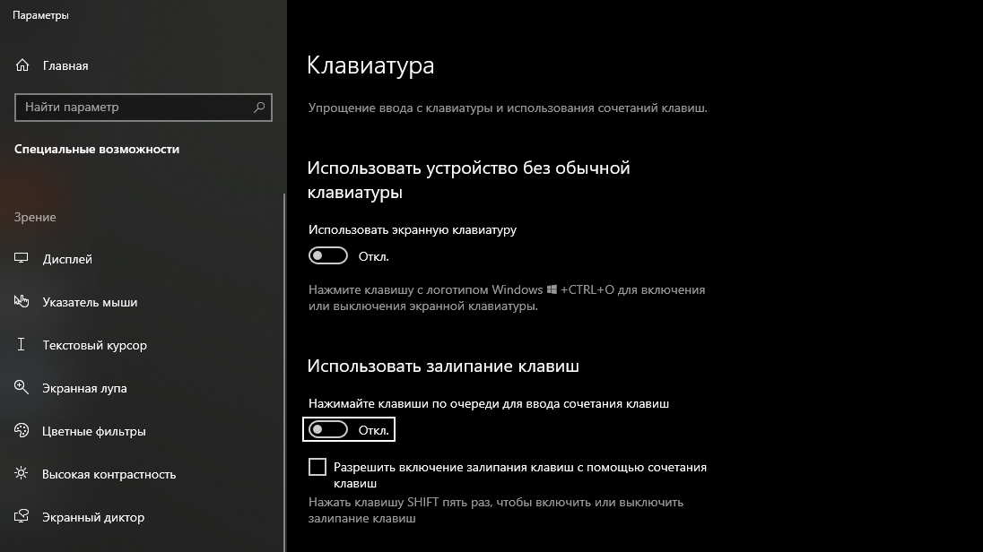- В Windows 10 и 11. Откройте «Параметры» / «Специальные возможности» / в левом меню «Клавиатура» и найдите пункт «Использовать залипание клавиатуры» — переключите в нужное положение.