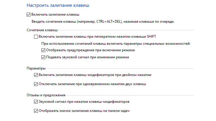 Windows предлагает меньше опций — там можно лишь включить или отключить залипание и разрешить или запретить его активацию через нажатие Shift пять раз.
