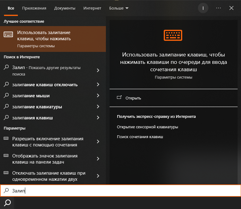 Можно активировать функцию и через меню поиска. В панели задач, в нижнем левом углу экрана, щелкните по значку поиска и введите запрос «Залип». В появившемся списке результатов выберите пункт «Использовать залипание клавиш» — это и есть раздел настройки функции Sticky Keys.
