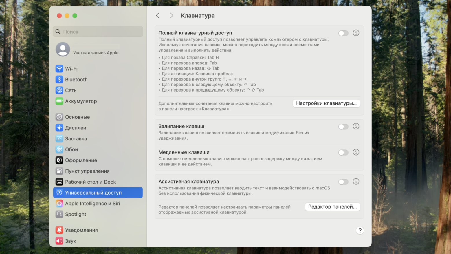 На компьютерах Apple подход более осознанный: включение и выключение Sticky Keys происходит только через меню «Универсальный доступ» или сочетанием клавиш Option + Command + F5, вызывающим панель специальных возможностей. Там следует изменить положение ползунка «Залипание клавиш» на необходимое. Случайно включить функцию почти невозможно.