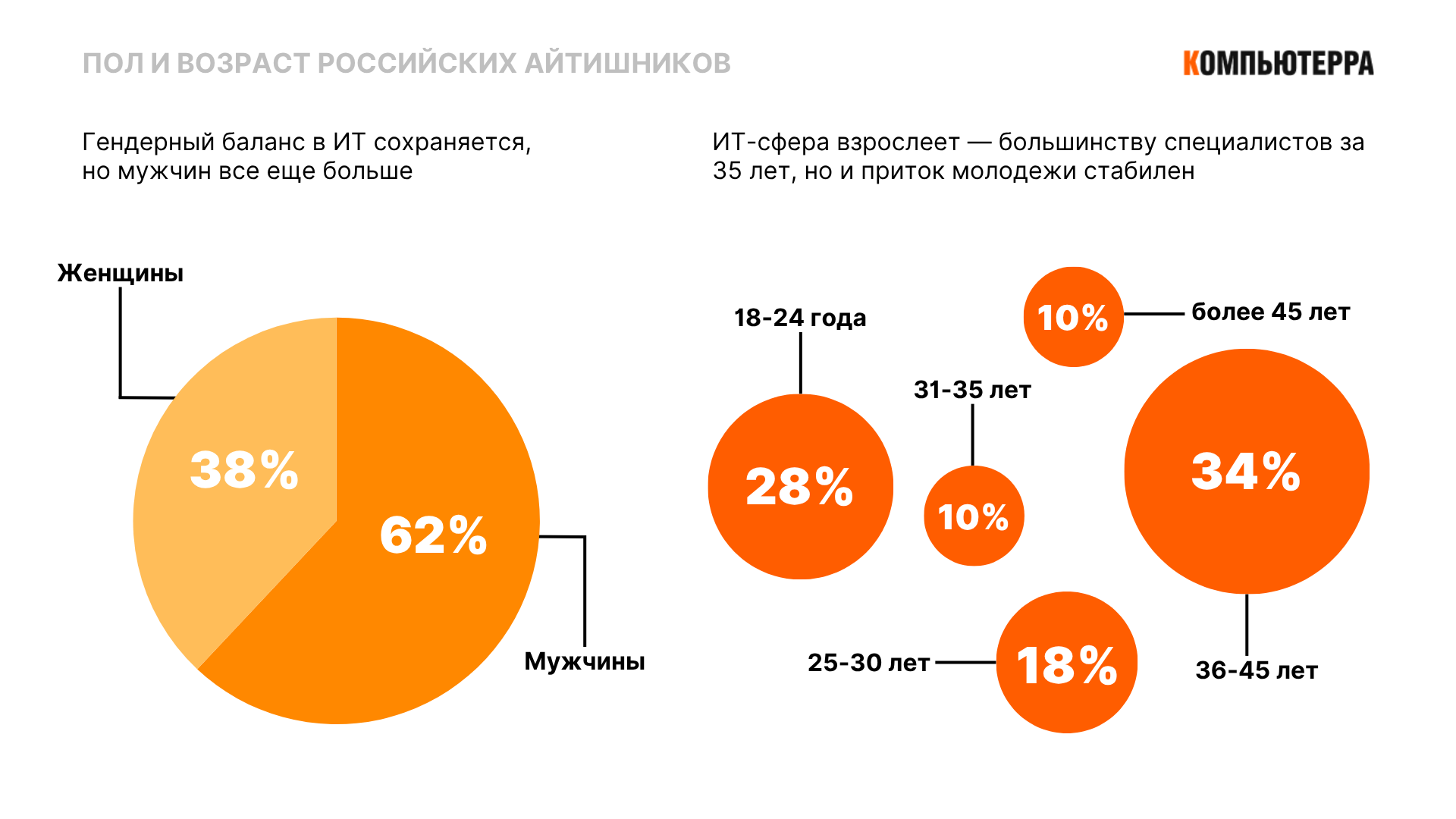 Гендерный баланс постепенно выравнивается, хотя мужчины по-прежнему преобладают в отрасли — их 62%. Зато 38% женщин в ИТ — уже не статистическая погрешность, а ощутимая сила.