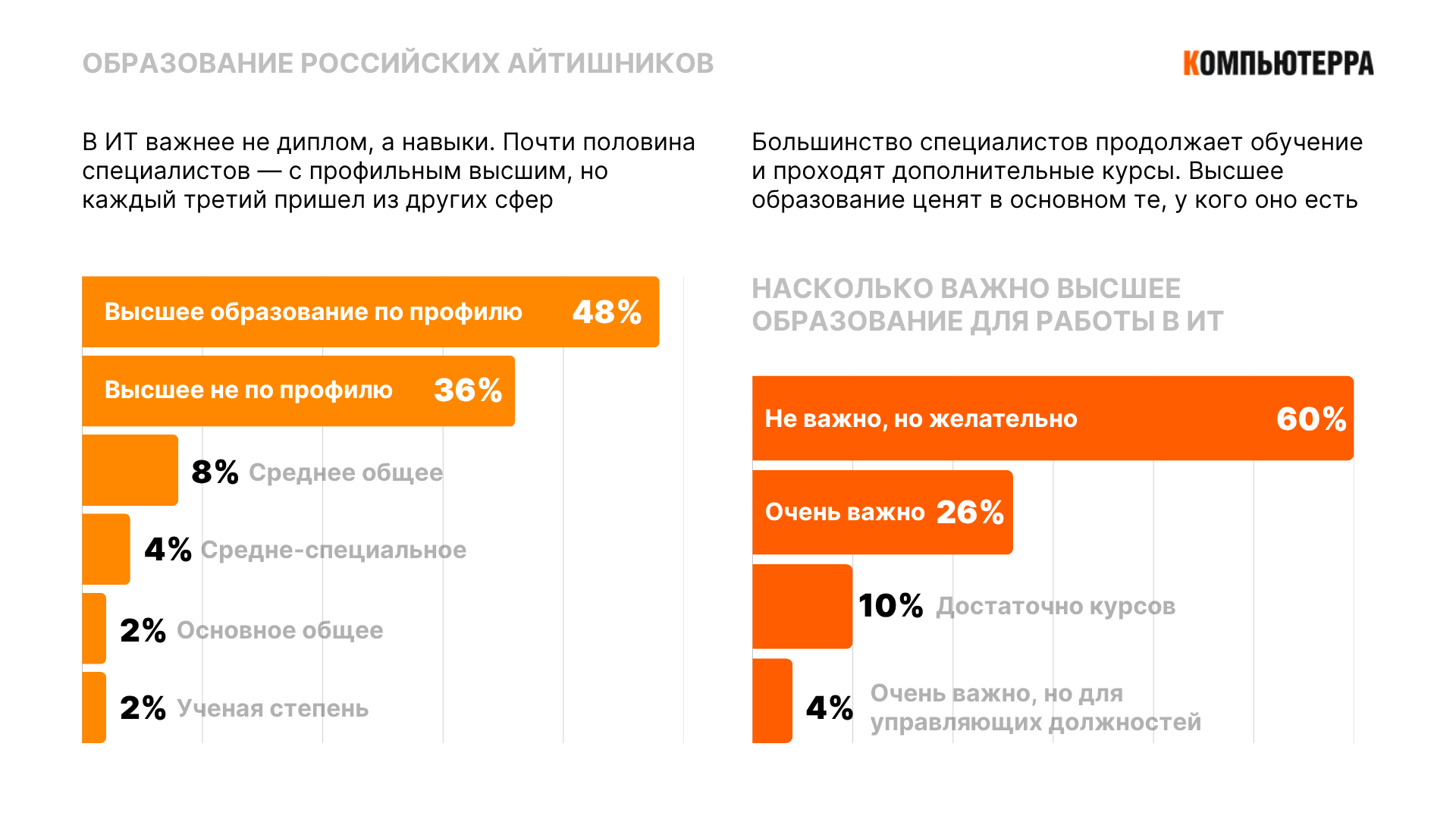 Высшее образование ценят в основном те, у кого оно есть, а вот специалисты, которые пришли в ИТ с курсами или колледжем, доказывают обратное на деле. Кстати, большинство айтишников продолжают обучаться — 74% заявили, что проходили дополнительные курсы в области ИТ.