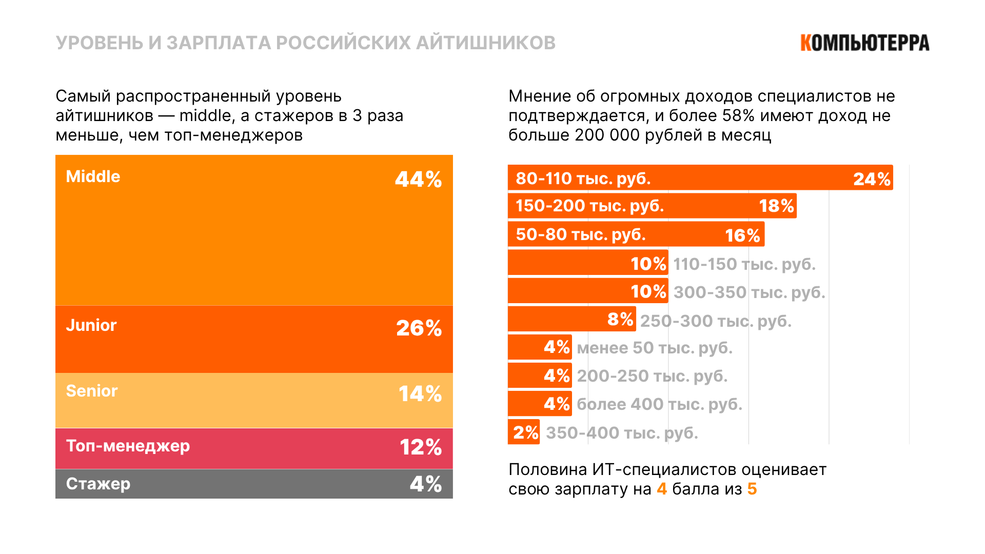 Мнение об огромных доходах работников сферы ИТ не подтверждается. Наиболее распространенной зарплатой является 80-110 тыс. рублей в месяц — такой доход имеют 24% респондентов. На втором месте заработок 150-200 тыс. рублей в месяц — 18%.