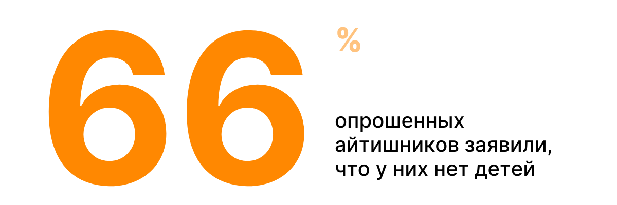 Заводить детей ИТ-специалисты тоже не торопятся. Целых 66% ответили, что у них нет детей. 16% имеют одного ребенка, а 18% — двух и более.