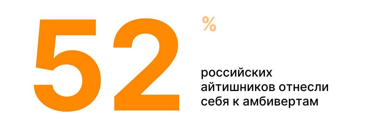 Старый стереотип о замкнутости технических специалистов также не подтверждается — лишь четверть айтишников причисляют себя к интровертам. А вот 52% респондентов отнесли себя к амбивертам — это те, кто сочетают в себе черты интровертов и экстравертов. Еще 18% заявили, что считают себя экстравертами, а 6% затруднились с ответом.