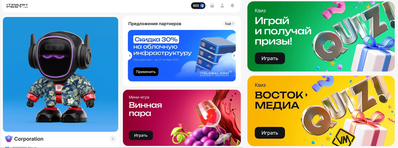 На ITPARK FEST заработала комплексная программа лояльности: участники проходили чекин-маршруты, решали интерактивные квизы, приглашали друзей через реферальную систему и выбирали призы на маркетплейсе. Все работало и онлайн, и офлайн — за активность начислялись баллы, и каждый сразу видел, как его действия влияют на результат.