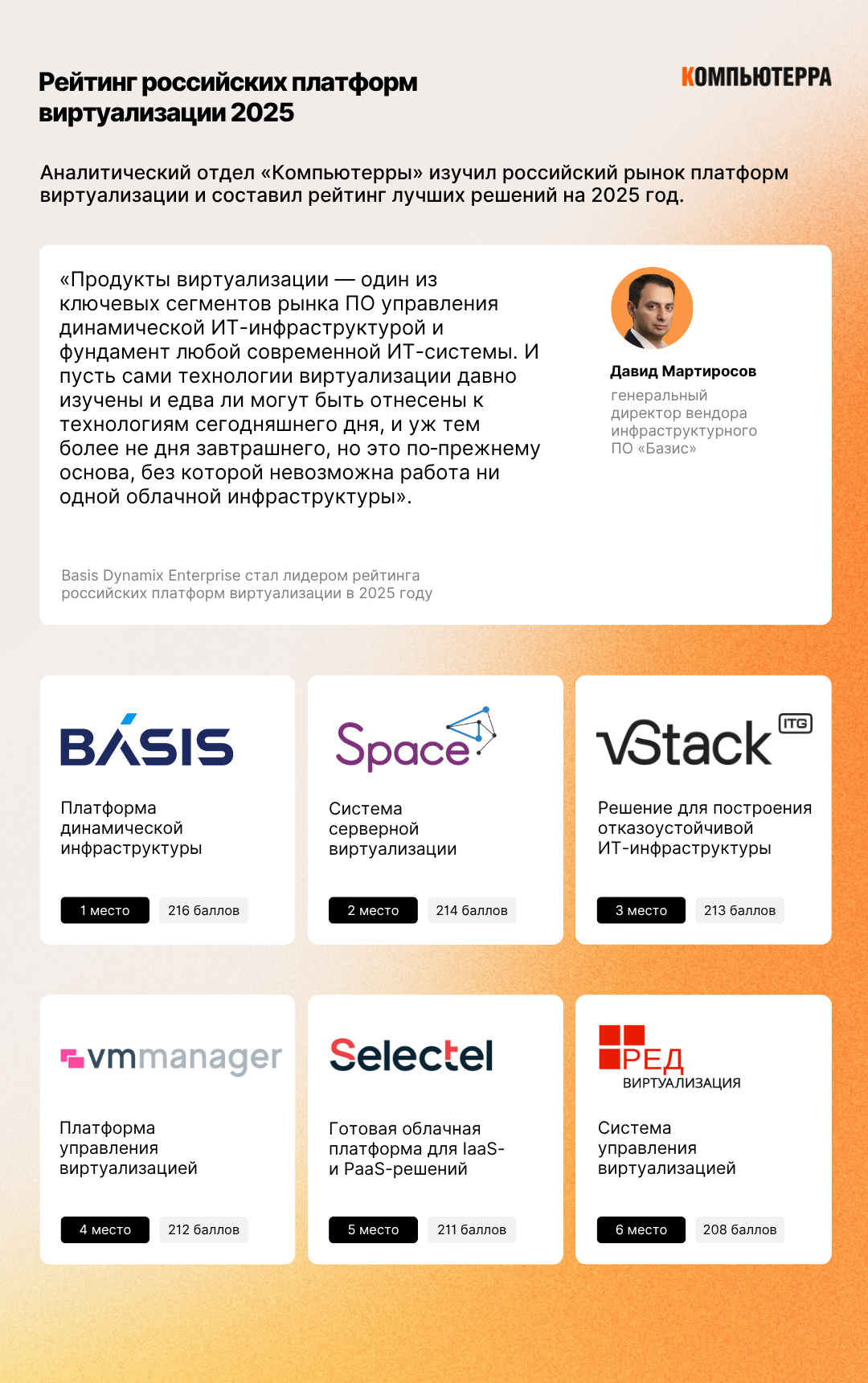 Лидером рейтинга российских платформ виртуализации стала Basis Dynamix Enterprise от компании «БАЗИС», набрав 216 баллов.