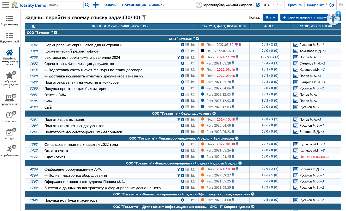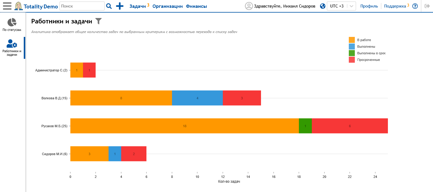 Единое информационное пространство Тоталити позволяет проводить комплексную и сквозную аналитику состояния дел. Система дает возможность отслеживать загруженность сотрудников, оценивать вклад каждого в выполнение задач и проектов, настраивать различные варианты представления данных, включая графики, диаграммы и отчеты, что создает условия для разностороннего анализа информации.
