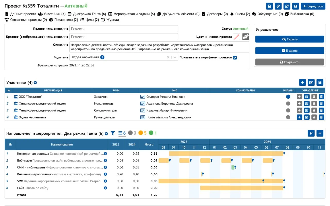 С помощью широкого инструментария в Тоталити формируются паспорт проекта, круг основных участников, интерактивная диаграмма Ганта, бюджет, риски, показатели и проектные изменения, о которых система проинформирует всех участников.