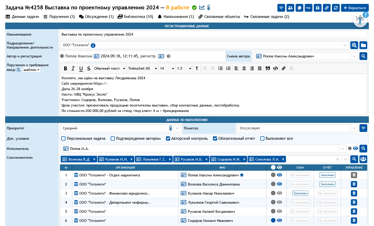 Для эффективной организации рабочего процесса доступны обмен файлами, обсуждения, системы поручений, уведомлений и напоминаний, что позволяет не терять данные, оперативно погружаться в суть рабочего процесса и принимать взвешенные решения.