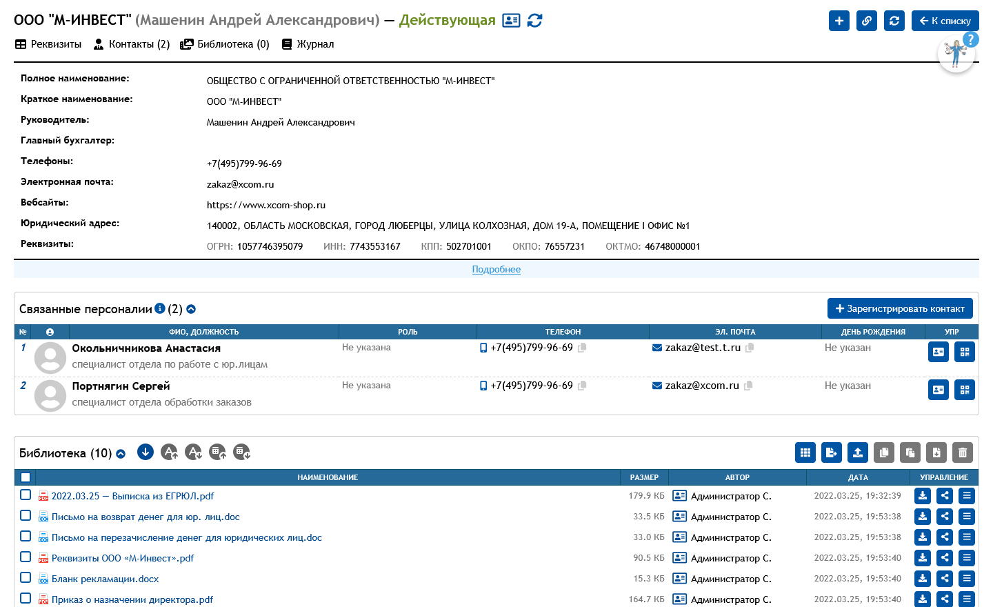 Система включает в себя реестр заказчиков и подрядчиков, для каждого из которых формируется расширенная карточка, содержащая реквизиты, контакты представителей и библиотеку документов, подтверждающих должную осмотрительность. Благодаря гибкому поиску по широкому набору атрибутов в Тоталити можно быстро найти нужную информацию.