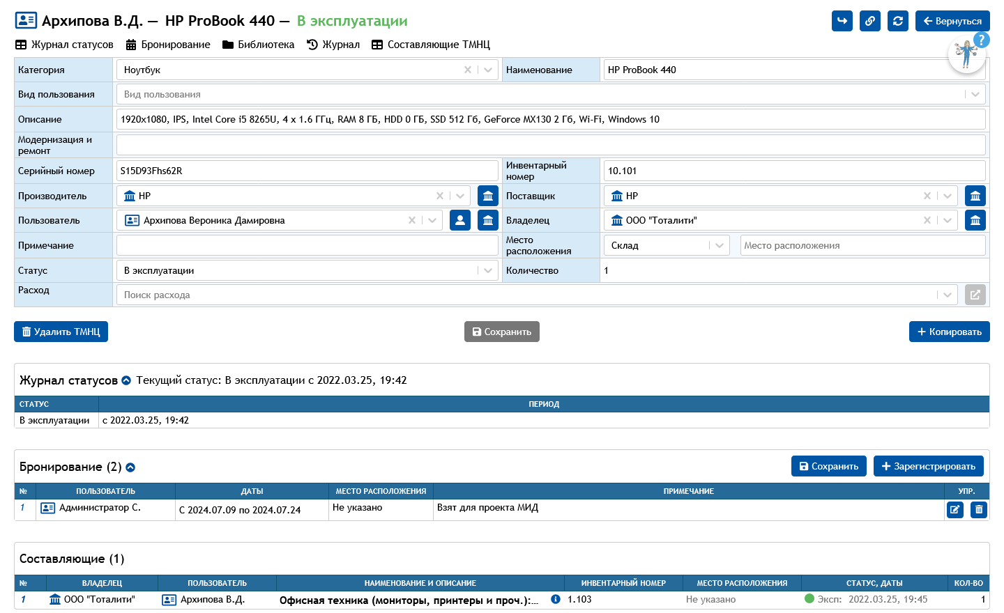 Тоталити предоставляет базовый функционал для управления реестром материальных и нематериальных активов. По каждой позиции, например, ноутбуку, серверу, принтеру или авто, учитываются ответственные, сроки службы и расходы на товарно-материальные ценности (ТМЦ), а также ведется журнал действий, которые производятся с ТМЦ.