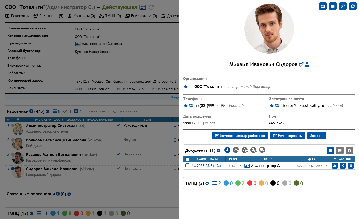 Значимая часть внедренного в Тоталити функционала отведена управлению персоналом компании. В системе формируется организационно-штатная структура в виде наглядного иерархического справочника подразделений компании, в каждом из которых отображены списки штатных и привлекаемых работников с их контактами и документами.