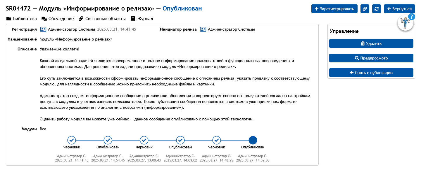Тоталити позволяет публиковать корпоративные новости, управлять каналами рассылки и отслеживать процесс ознакомления рабочего коллектива с информацией. Дополнительно в системе реализован функционал локальных уведомлений о релизах, которые можно настроить для отдельного модуля.
