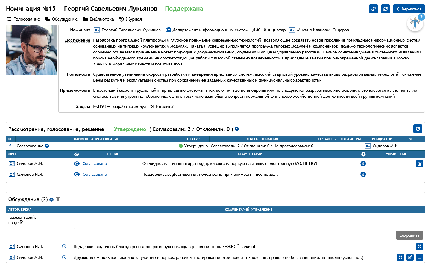В Тоталити встроена технология мотивации, которая дает возможность отметить личный вклад каждого специалиста в развитие компании. Решение о премировании формируется по итогам голосования соответствующих подразделений и основывается на оценке вклада по критериям практической полезности и применимости.