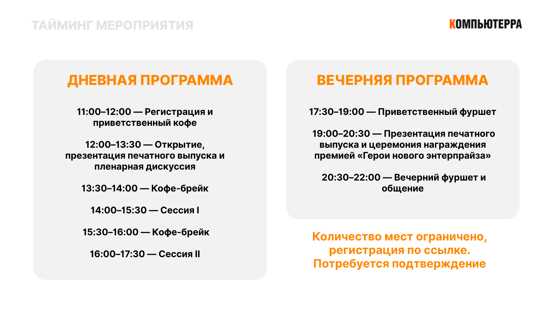 После завершения деловых сессий с 17:30 участников ждет приветственный фуршет и неформальное общение. Вечером «Компьютерра» представит второй печатный выпуск и проведет церемонию премии «Герои нового энтерпрайза».