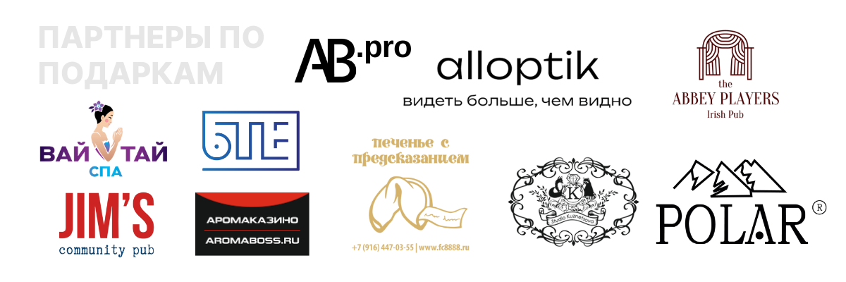 Среди партнеров по подаркам: Polar, игра AROMABOSS, Studio Kuznetsova, «Корпорация удачи», магазин оптики ALL OPTIK, сеть салонов тайского массажа «Вай Тай», компания БТЕ-системный интегратор, партнер по финансовому росту Анна Баранова, паб-театр Abbey и комьюнити-паб Jim’s.