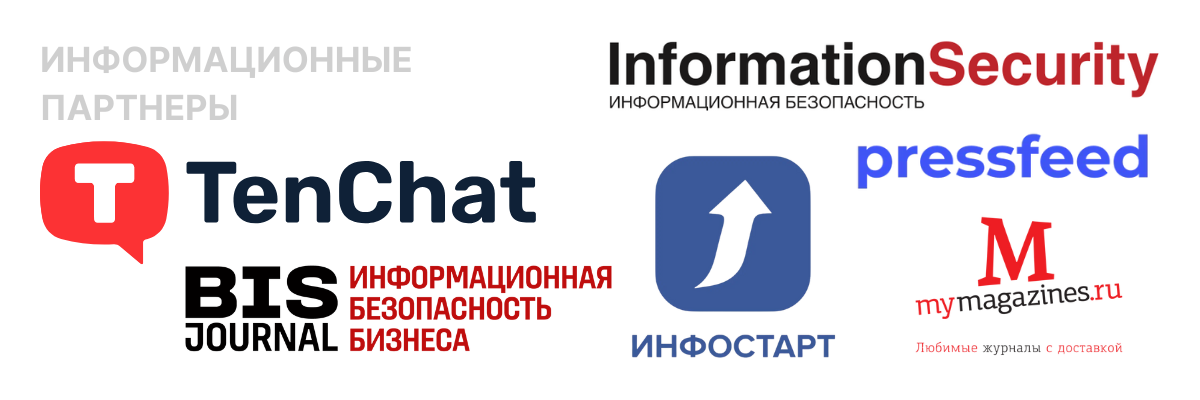 Информационными партнерами мероприятия стали: TenChat — соцсеть для поиска клиентов, работы и нетворкинга, BIS Journal — информационная безопасность бизнеса и InformationSecurity — информационная безопасность, MyMagazines.ru — новости подписки на журналы, «Инфостарт» — готовые решения на «1С» и Pressfeed.