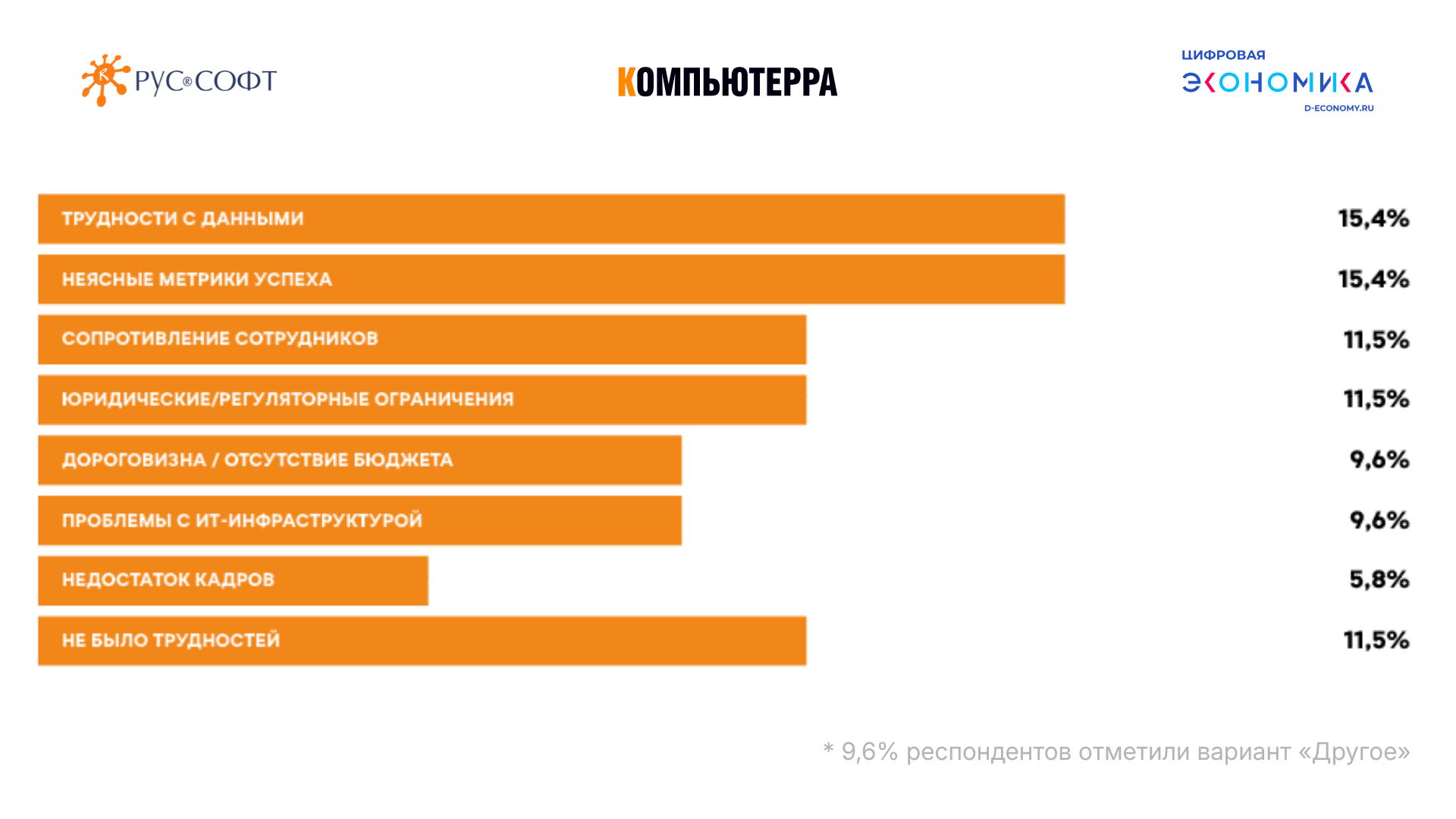 - На первом месте — проблемы с данными (15,4% кейсов): разрозненные источники, недостаточно чистые или неполные массивы, отсутствие единого формата и надежных механизмов актуализации. Эти трудности проявлялись и в коммерческих компаниях, и в ведомствах, особенно там, где накопленные данные создавались годами и не были предназначены для машинной обработки.
