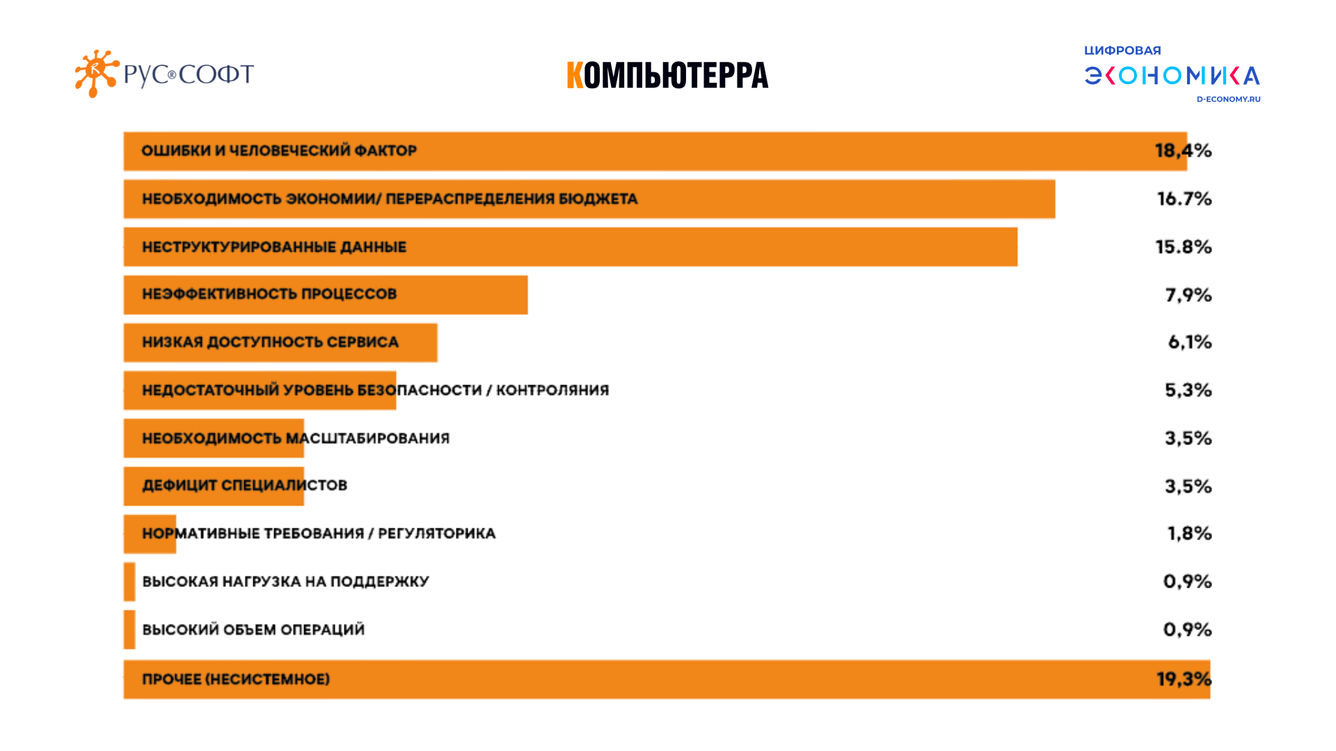 На втором месте — ошибки и человеческий фактор (18,4%), что характерно для сегментов с большим документооборотом, сложными операциями и высокой стоимостью неправильных действий.