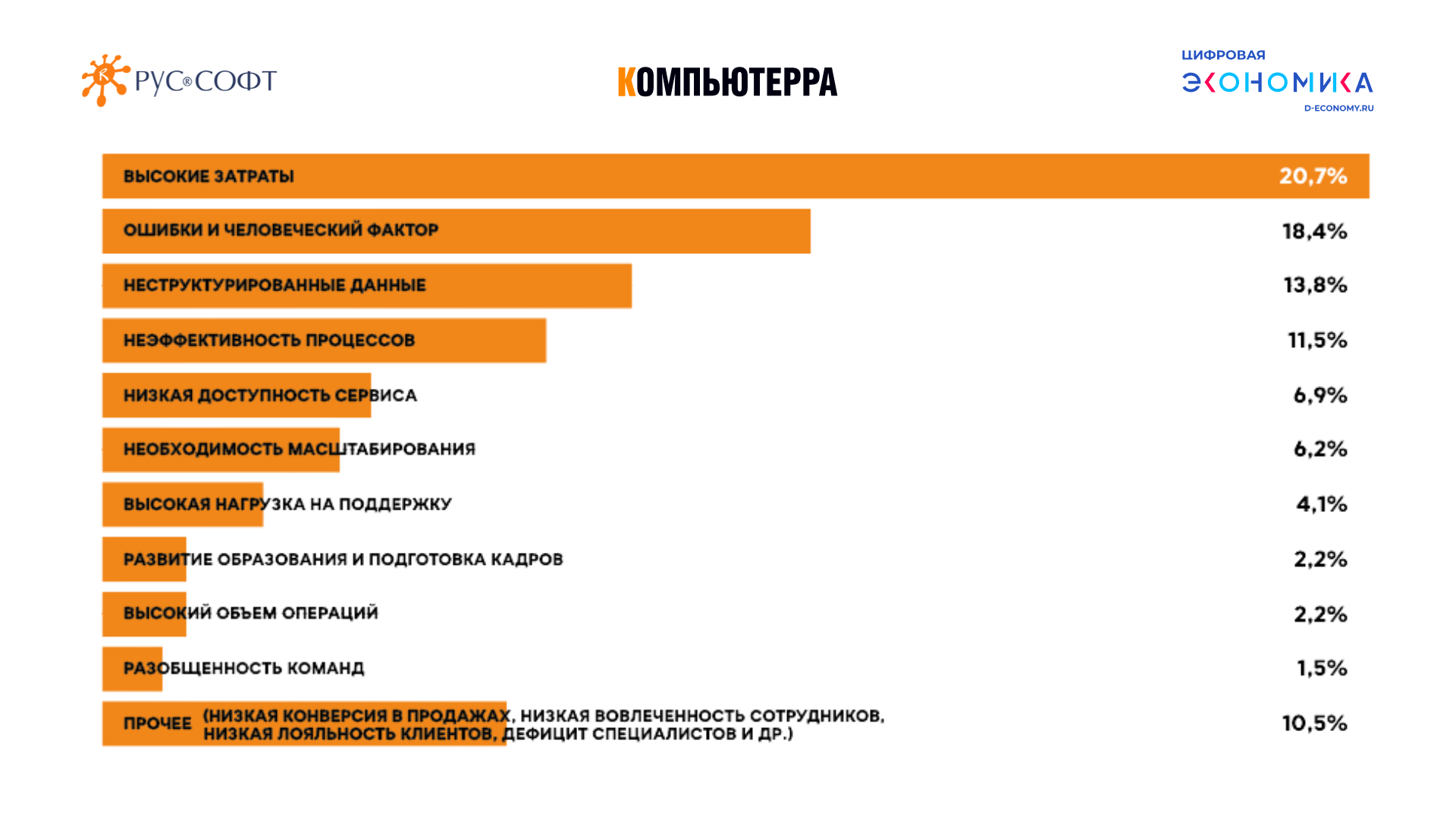 Еще 11,5% внедрений были мотивированы неэффективностью процессов — медленной обработкой запросов, сложными маршрутами, избыточными согласованиями.