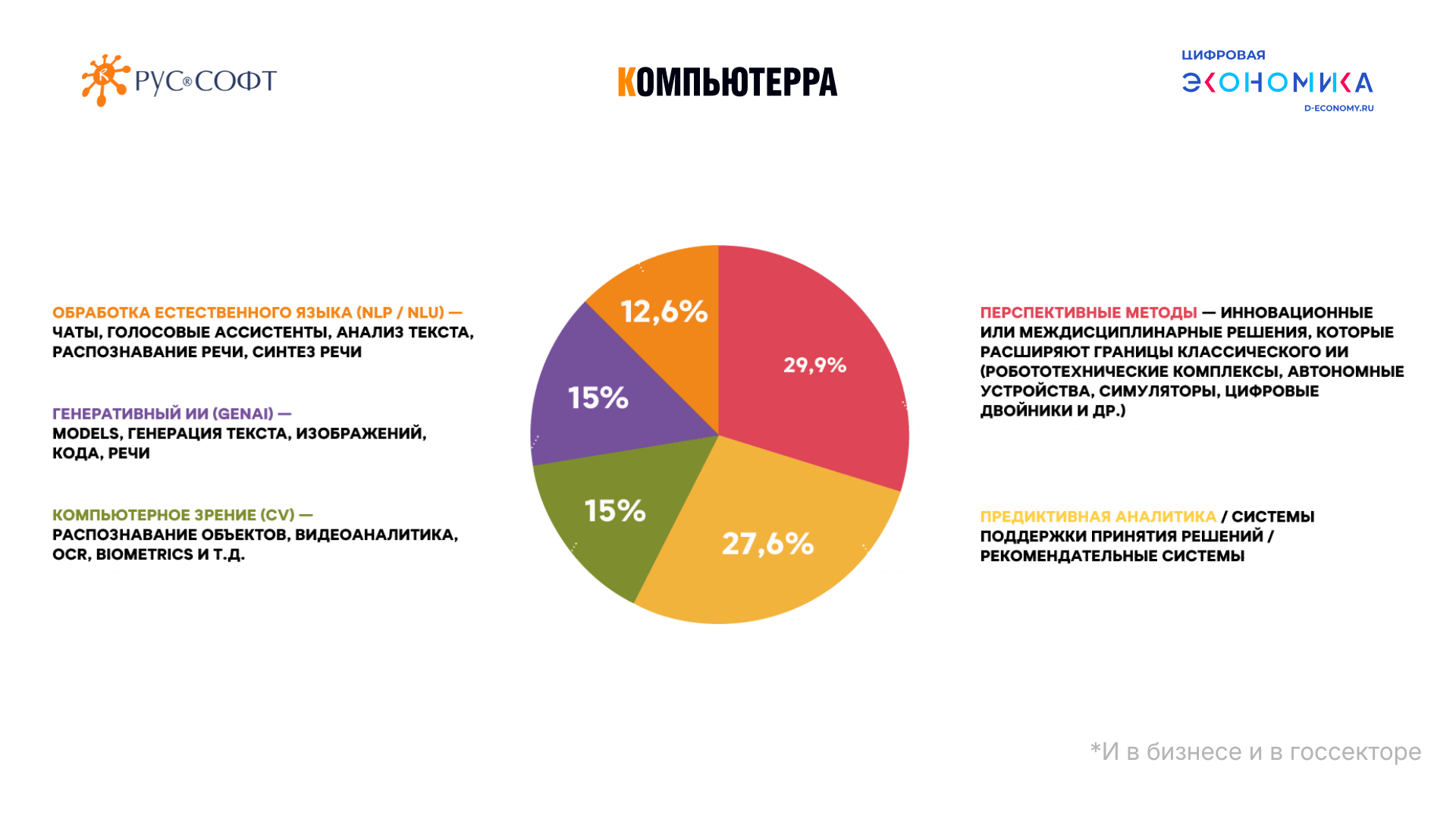 Государственный сектор демонстрирует собственный профиль. В административных процессах, муниципальном управлении, социальной сфере и транспортной инфраструктуре наиболее востребованы системы поддержки решений (35%) и компьютерное зрение (29%), а NLP занимает 18% — это отражает нагрузку на документы, обращения граждан и контент государственных сервисов.