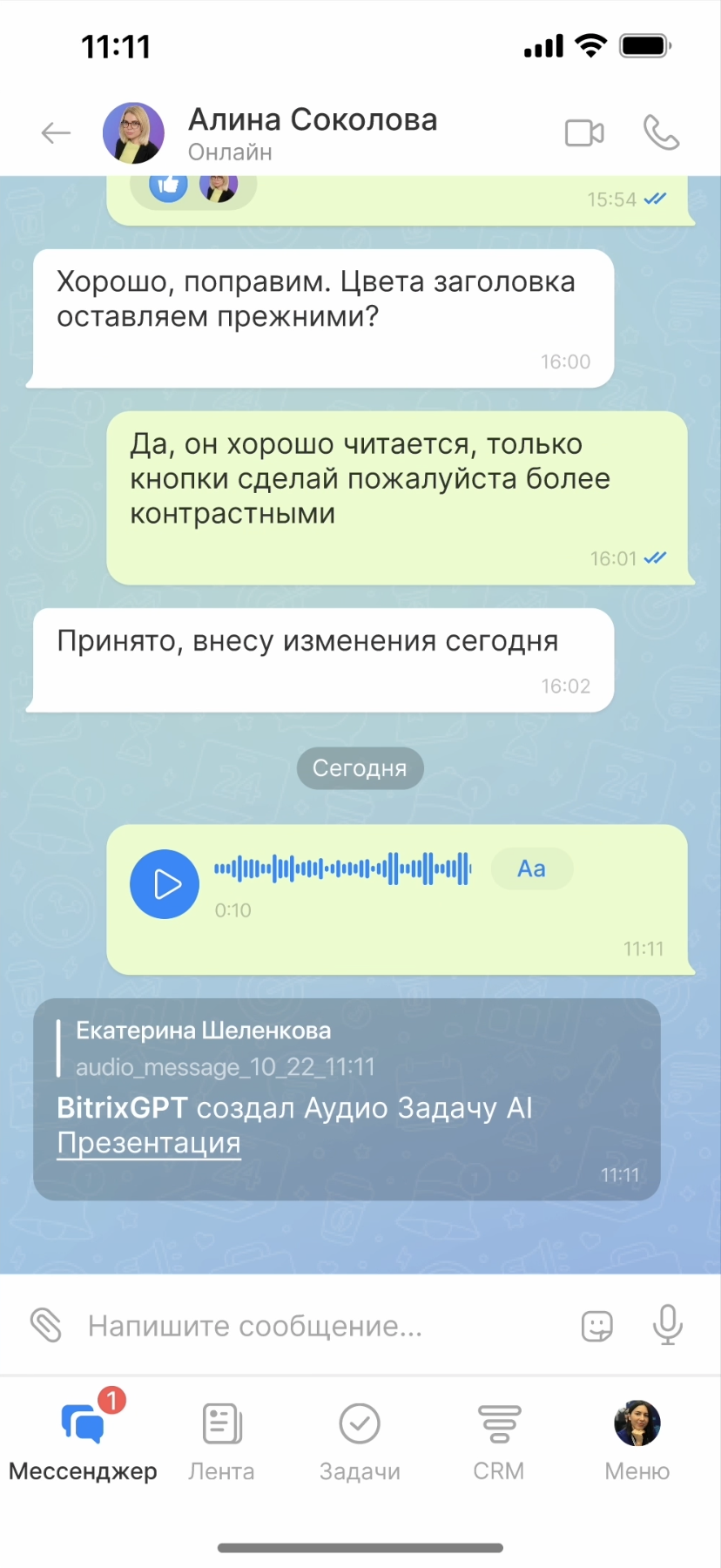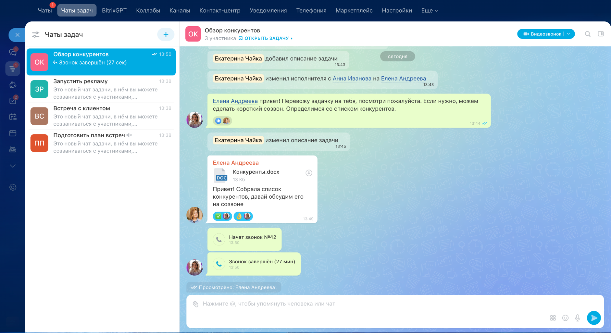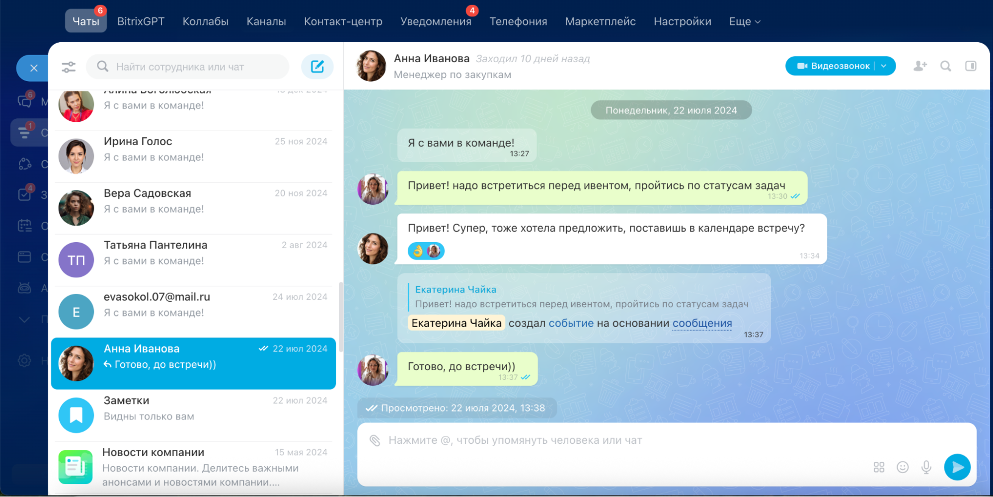 Мессенджер «Битрикс24» — это чат внутри рабочего пространства, а не отдельное приложение. Внешне он устроен как привычные мессенджеры: есть личные и групповые чаты, каналы, реакции, стикеры, опросы. Но ключевое отличие в том, что переписка здесь не оторвана от работы.