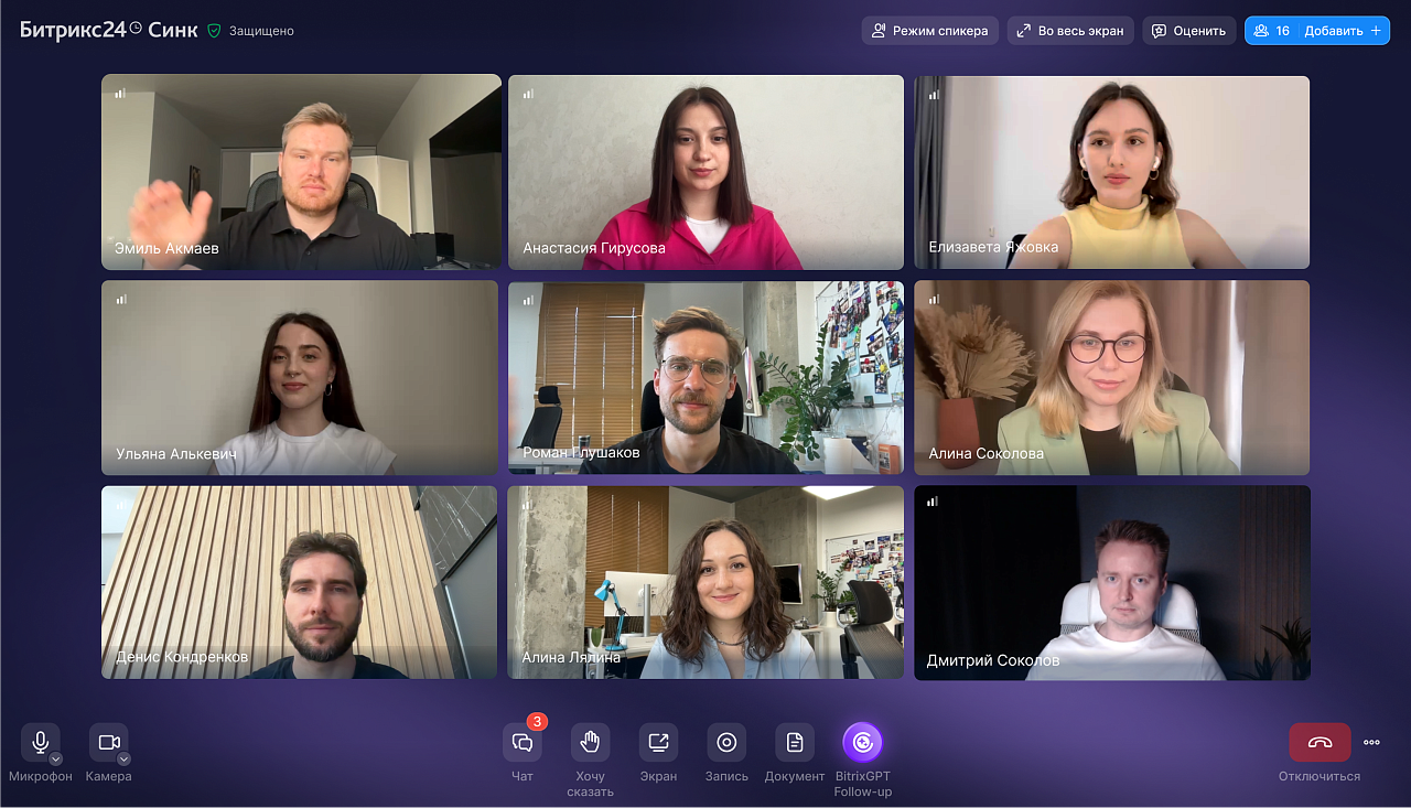 Видеозвонок начинается сразу, без отправки ссылок, и команда может общаться без лимита по времени. Во время звонка несколько участников могут делиться экраном. Звонок можно записывать, запись сохранится в облаке, а в чате все участники получат ссылку на запись.
