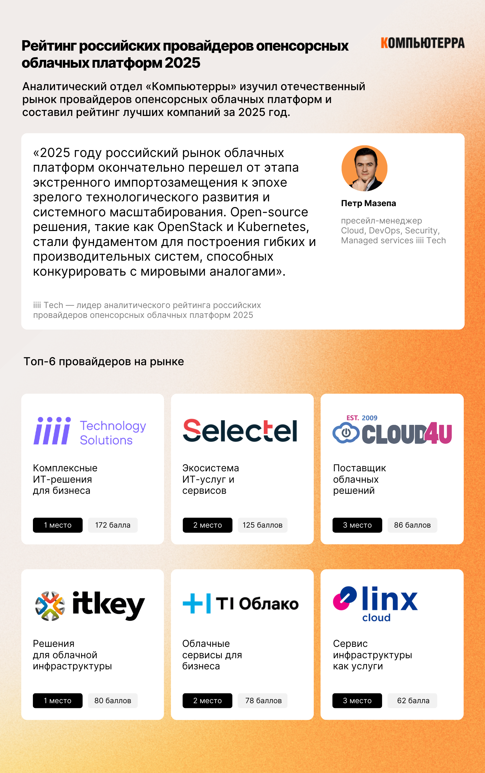 Аналитический отдел «Компьютерры» изучил отечественный рынок провайдеров опенсорсных облачных платформ и составил рейтинг лучших компаний за 2025 год.