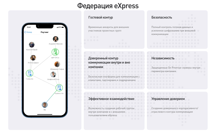 Ключевая задача, которую eXpress решает для заказчиков, — безопасное рабочее взаимодействие внутри компании и за ее пределами. Платформа используется в крупных организациях, включая компании из ТОП-20 списка РБК, и строится вокруг принципа полного контроля над корпоративными коммуникациями. Этот уровень безопасности достигается за счет нескольких базовых механизмов: