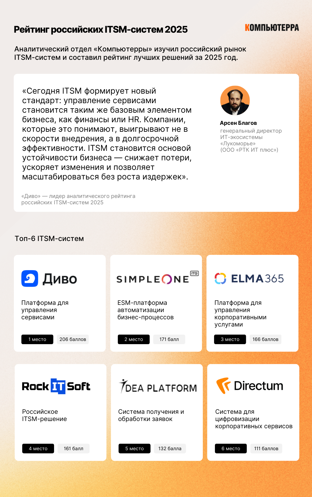 Лидером рейтинга российских ITSM-систем стала платформа «Диво» от компании «Лукоморье» («РТК ИТ плюс»), набрав 206 баллов.