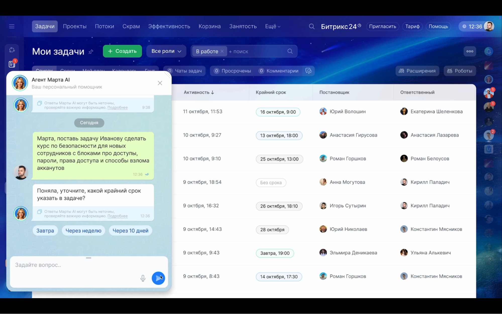 В «Битрикс24» задачи не живут отдельно от остальной работы. Они связаны с CRM, чатами, звонками, календарем и документами, поэтому поручения не приходится переносить вручную из переписки в трекер. Например, если коллега пишет в чате и просит, когда появится время, прислать документы по прошлогоднему проекту, из сообщения можно сразу создать задачу в один клик, назначить срок и ответственного. Так просьба не потеряется в потоке, у нее будет срок и сервис сам пришлет напоминания.