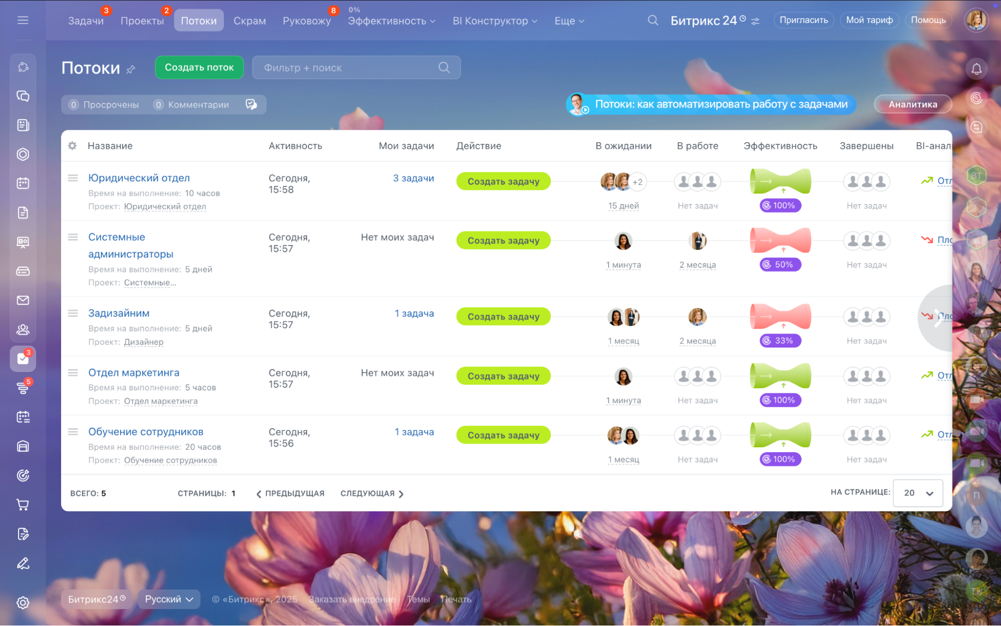 Потоки в «Битрикс24» помогают навести порядок во входящих задачах для сервисных отделов — бухгалтерии, маркетинга, юристов, HR и других команд. Система сама распределяет их по заданным правилам — по очереди, через руководителя или сами сотрудники выбирают, за какую задачу взяться.