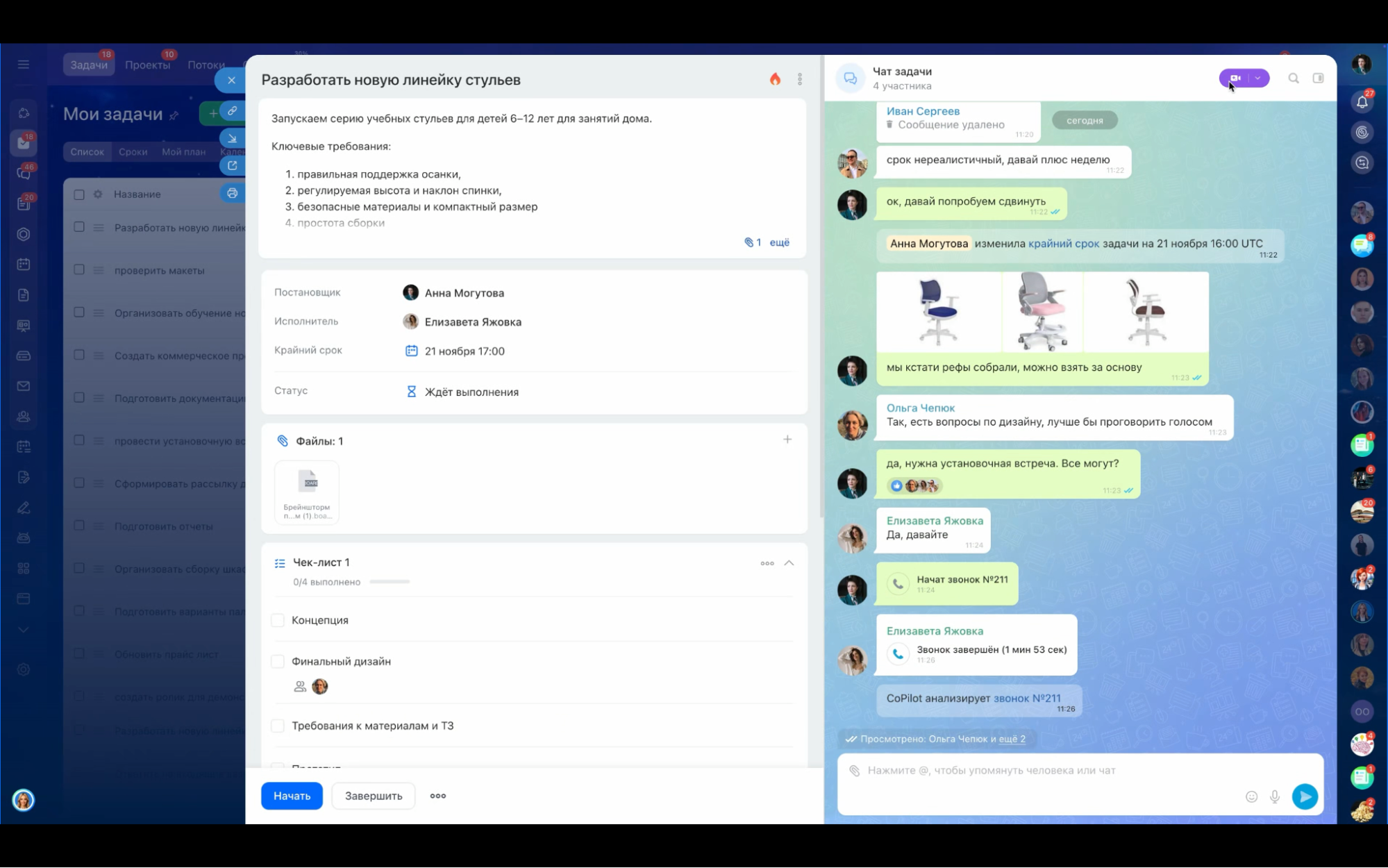 В каждой задаче есть чат для обсуждения. Можно быстро обсудить подробности, созвониться по видео и прикрепить нужные файлы. Это снижает количество переписок в сторонних мессенджерах и упрощает поиск договоренностей: вся информация остается в контексте конкретной задачи.