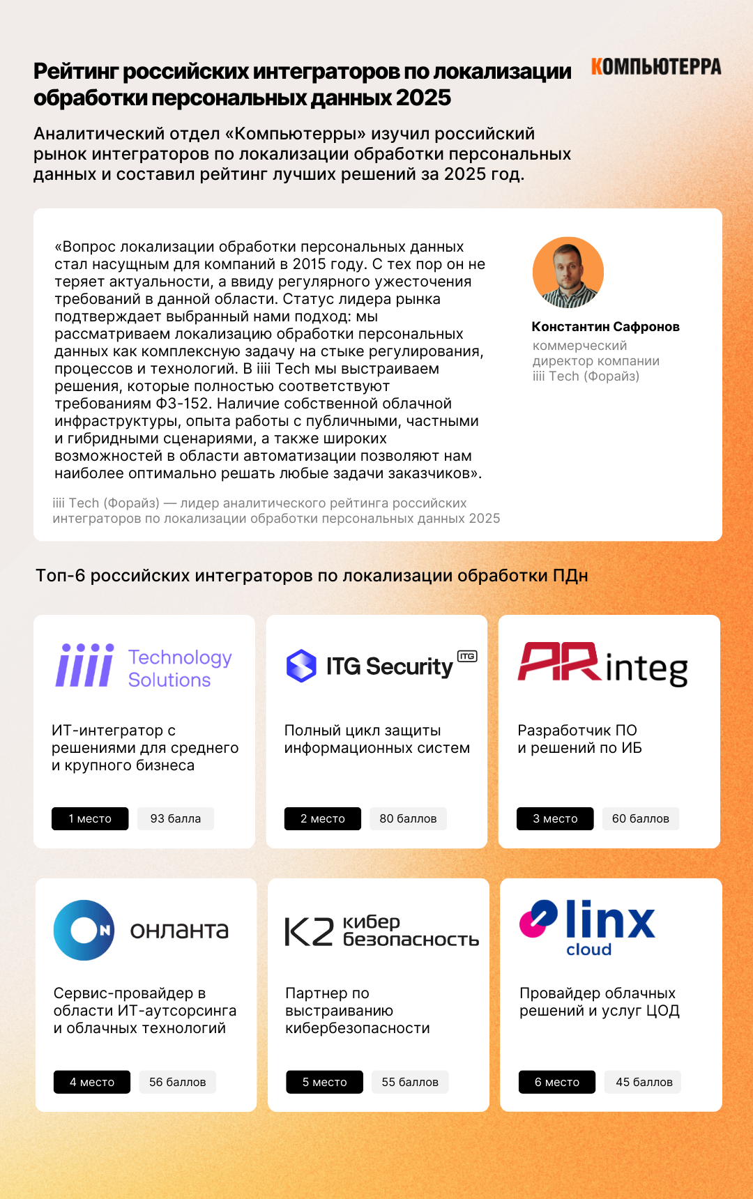 Лидером рейтинга российских интеграторов по локализации обработки персональных данных стала компания iiii Tech («Форайз»), набрав 93 балла.