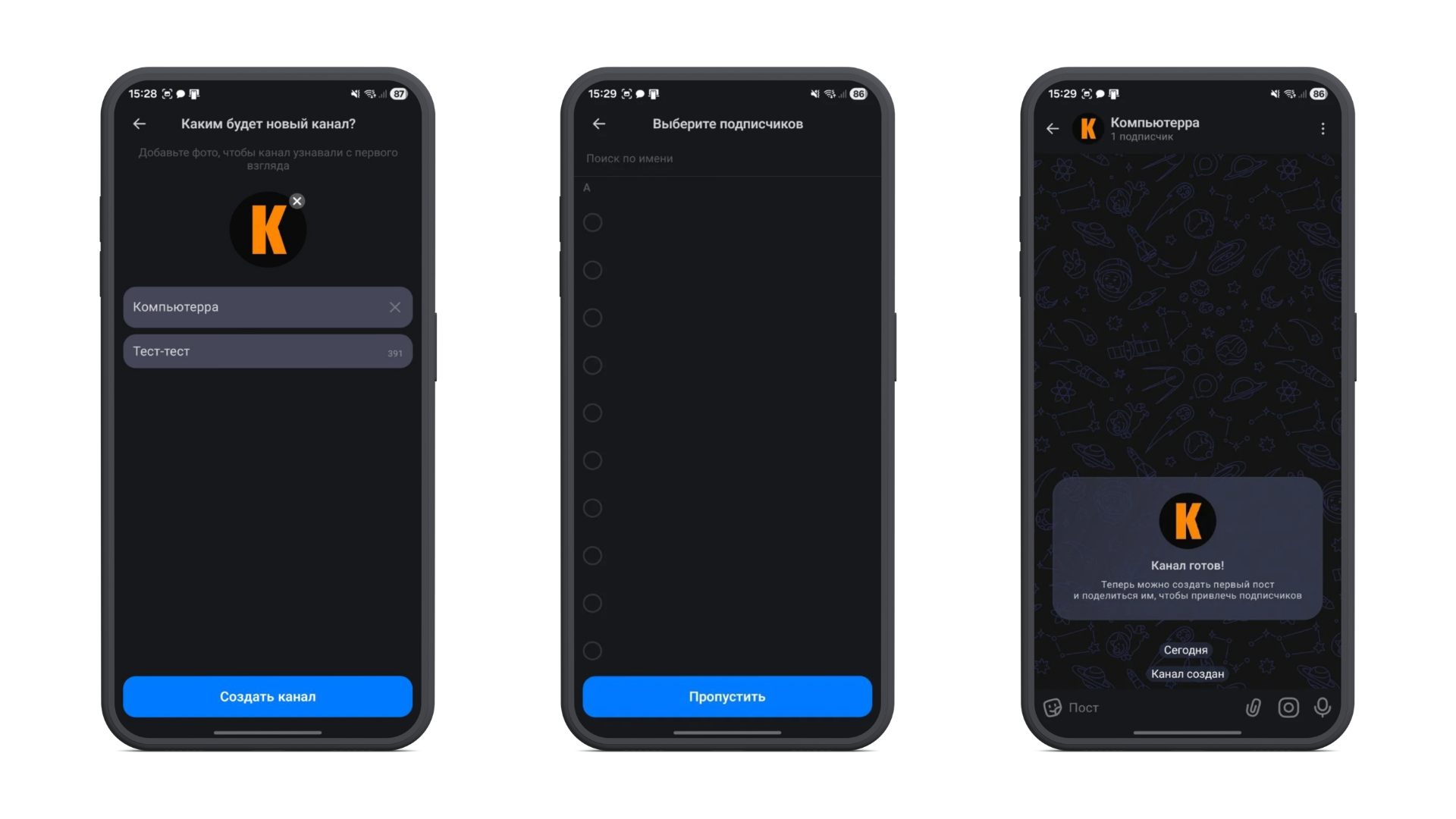 После завершения настройки канал появится в списке чатов. Далее можно публиковать сообщения и распространять ссылку на приглашение.