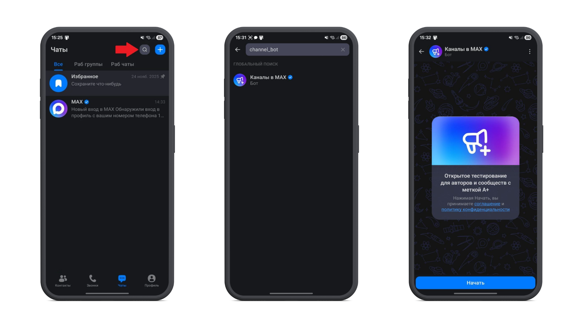 - В поиске MAX найдите чат-бота для создания каналов (например, @channel_bot или «Каналы в MAX»);