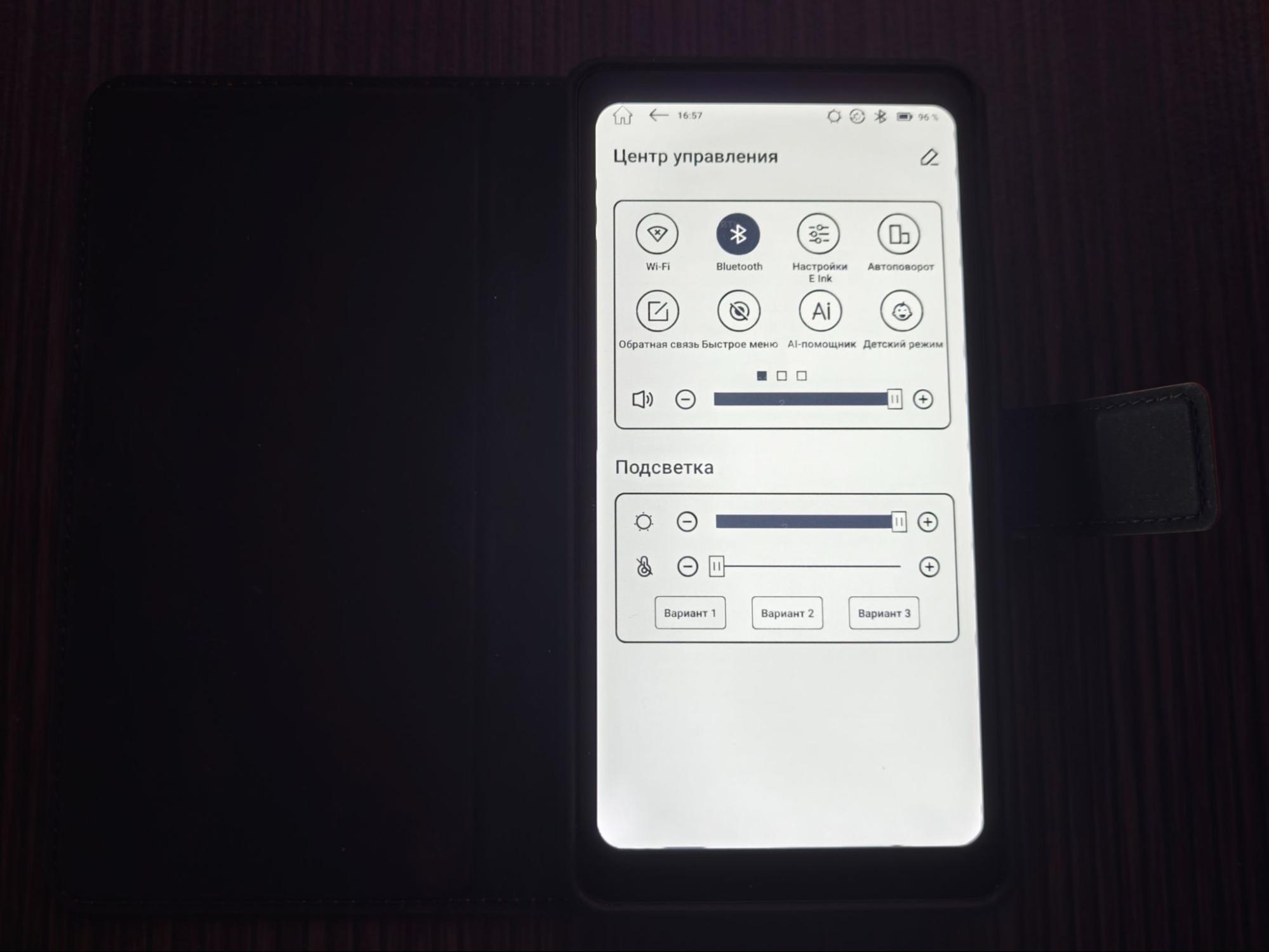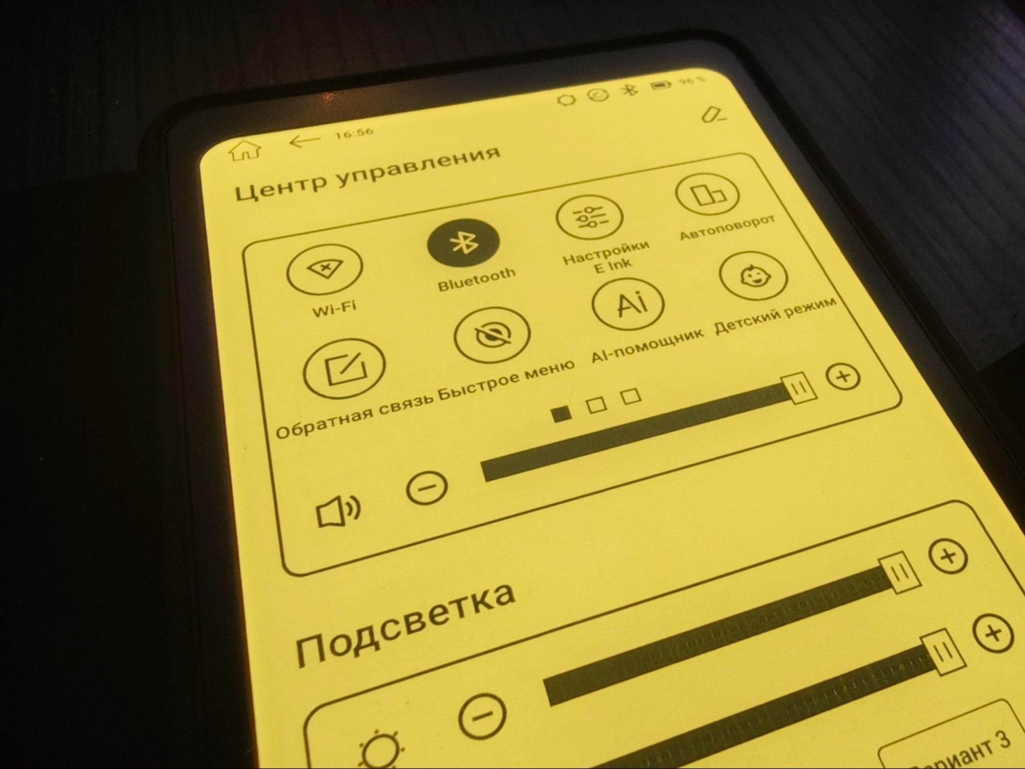 Меню с быстрыми настройками вызывается смахиванием вниз по правой стороне — так открывается шторка. В ней сосредоточены переключатели Wi-Fi и Bluetooth, автоповорот, детский режим, AI-помощник и кнопка обратной связи. Здесь же настраивается всё, что связано с экраном, например, параметры E Ink и ползунки подсветки.