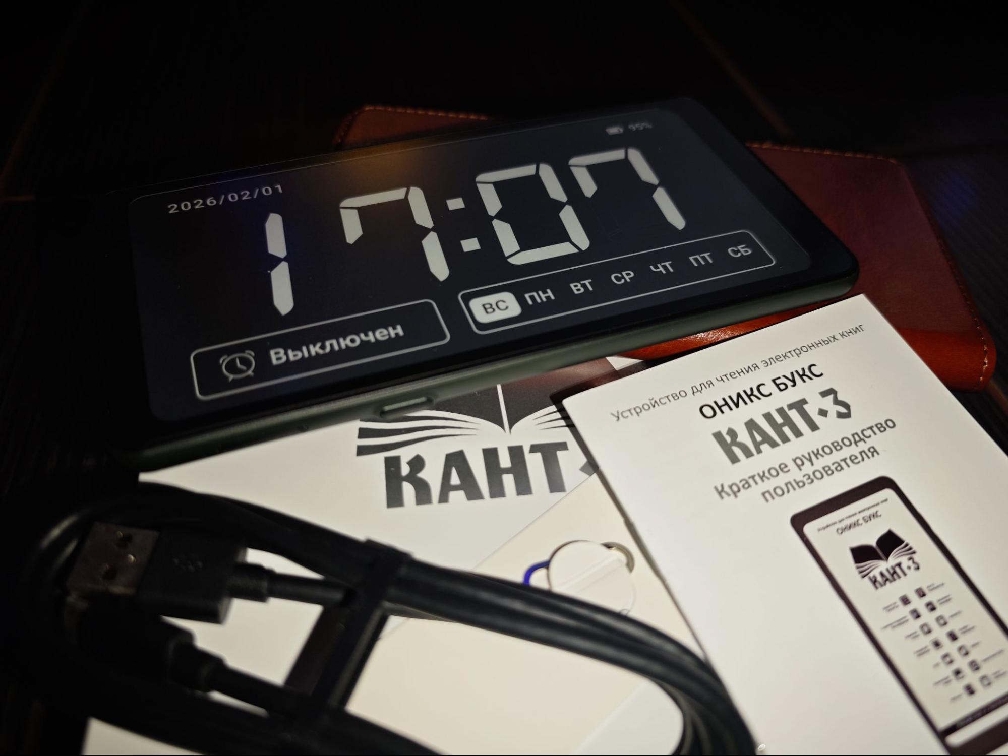 Комплект у «ОНИКС БУКС Кант 3» стандартный. В коробке — сам ридер, защитный чехол, кабель USB Type-C, «скрепка» для извлечения карты памяти, инструкция и гарантийный талон. Сетевого адаптера в комплекте нет, поэтому заряжать устройство придется от собственного блока питания либо от порта ноутбука.