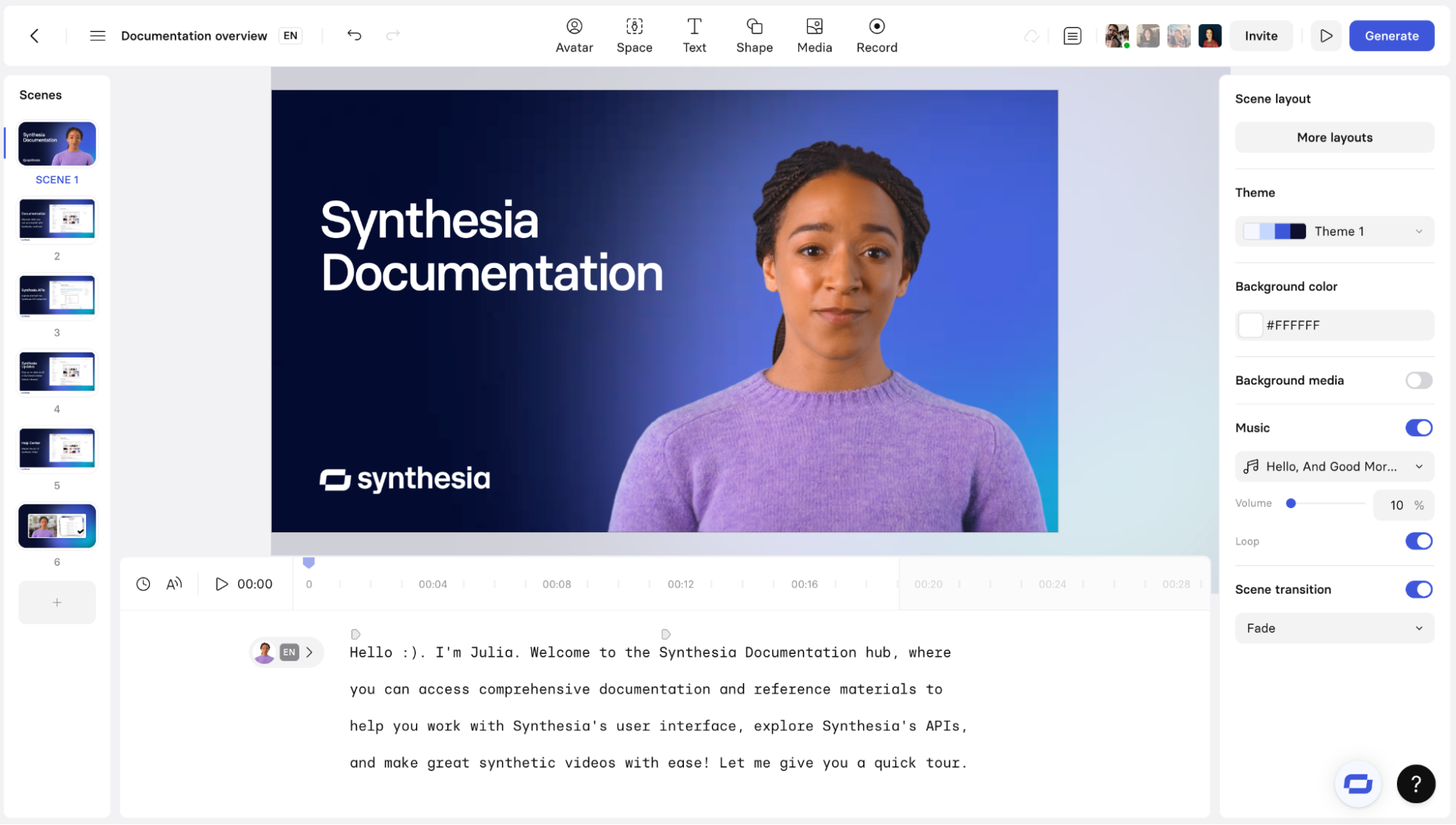 Synthesia — один из самых известных и зрелых сервисов в сегменте генерации видео с ИИ-аватарами. Платформа позволяет создавать ролики напрямую из текста, используя библиотеку из более чем 100 готовых цифровых ведущих с разной внешностью, стилем и подачей.