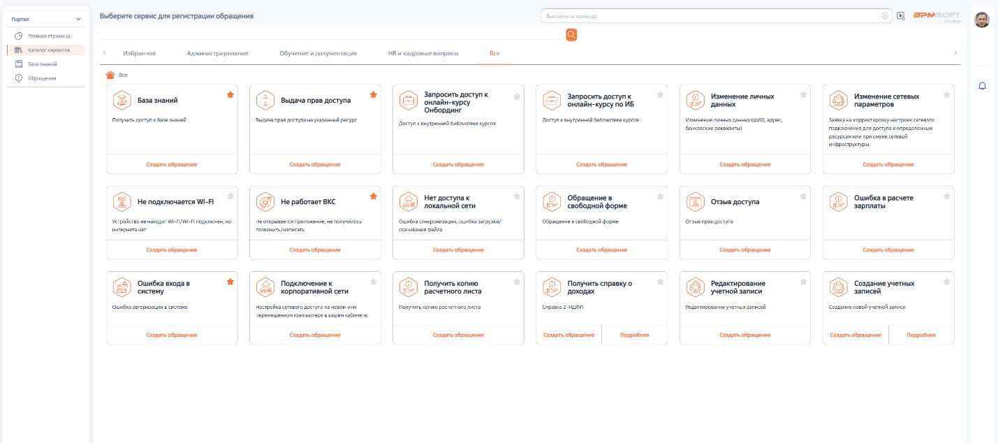 Также в платформе реализован Каталог сервисов, позволяющий организовать услуги в иерархическую структуру и использовать его как основной способ регистрации обращений. Для пользователей это выглядит как понятный каталог с категориями, поиском и избранными сервисами. При этом сохраняется гибкость: если нужного сервиса нет, обращение можно зарегистрировать в свободной форме без потери корректной маршрутизации и логики обработки.