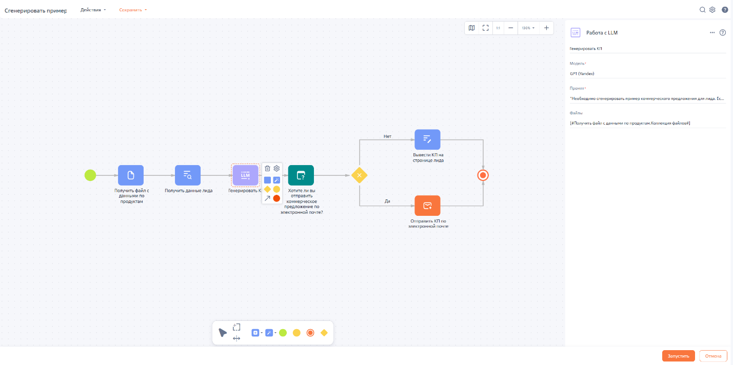Основная задача пользователя – передать в новый элемент БП корректный набор данных и задать промпт-запрос, определяющий, каким образом LLM-модель должна обработать информацию и как представить результат