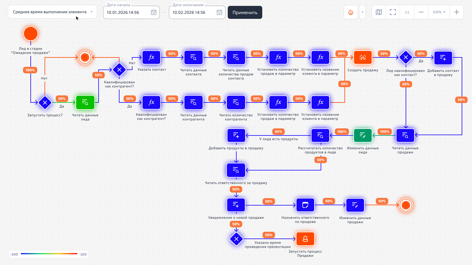 В релизе BPMSoft 1.9 в платформе появился новый инструмент визуальной аналитики — тепловая карта бизнес-процессов, который «раскрашивает» процессы в зависимости от выбранных метрик, подсвечивая «горячие» (проблемные или интенсивные) и «холодные» зоны.