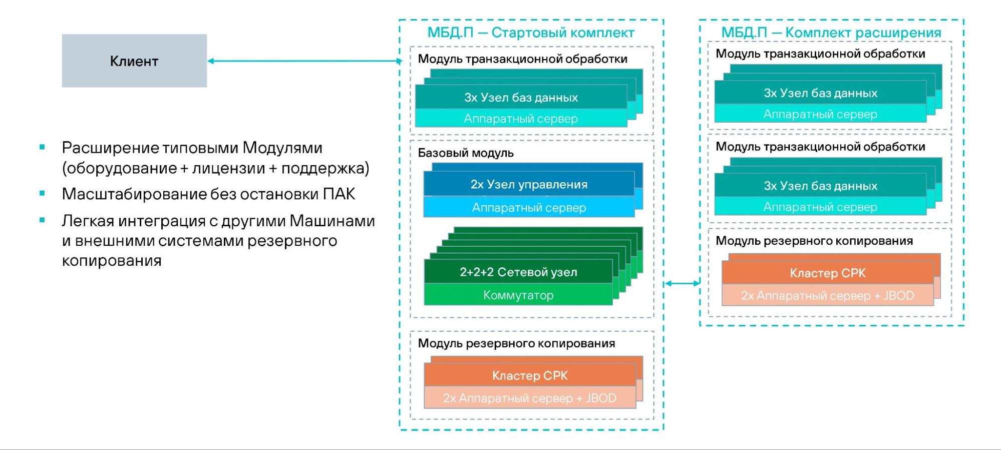 ПАК предназначен для работы с БД большого размера, построения высоконагруженных систем федерального уровня с высокими требованиями к производительности и надежности.