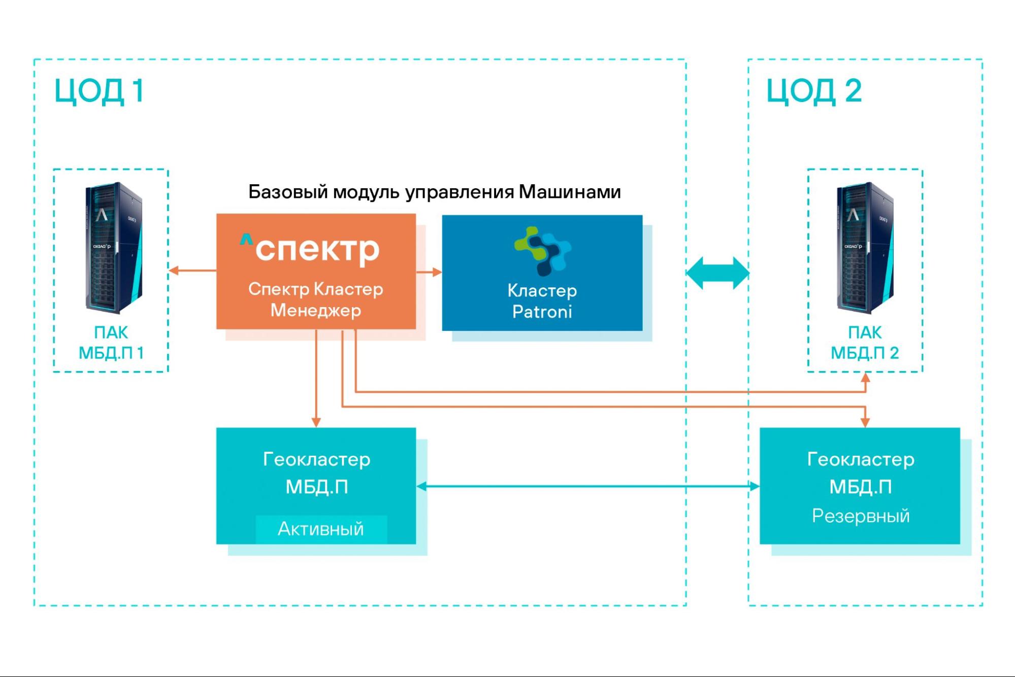 - Режим геокластера предназначен для построения катастрофоустойчивых решений между географически удаленными площадками. Он предполагает расположение Машин МБД.П на большом отдалении друг от друга с большими сетевыми задержками. В режиме геокластера все рутинные операции автоматизированы, что позволяет сократить работу DBA-инженера с нескольких часов до десятка минут.