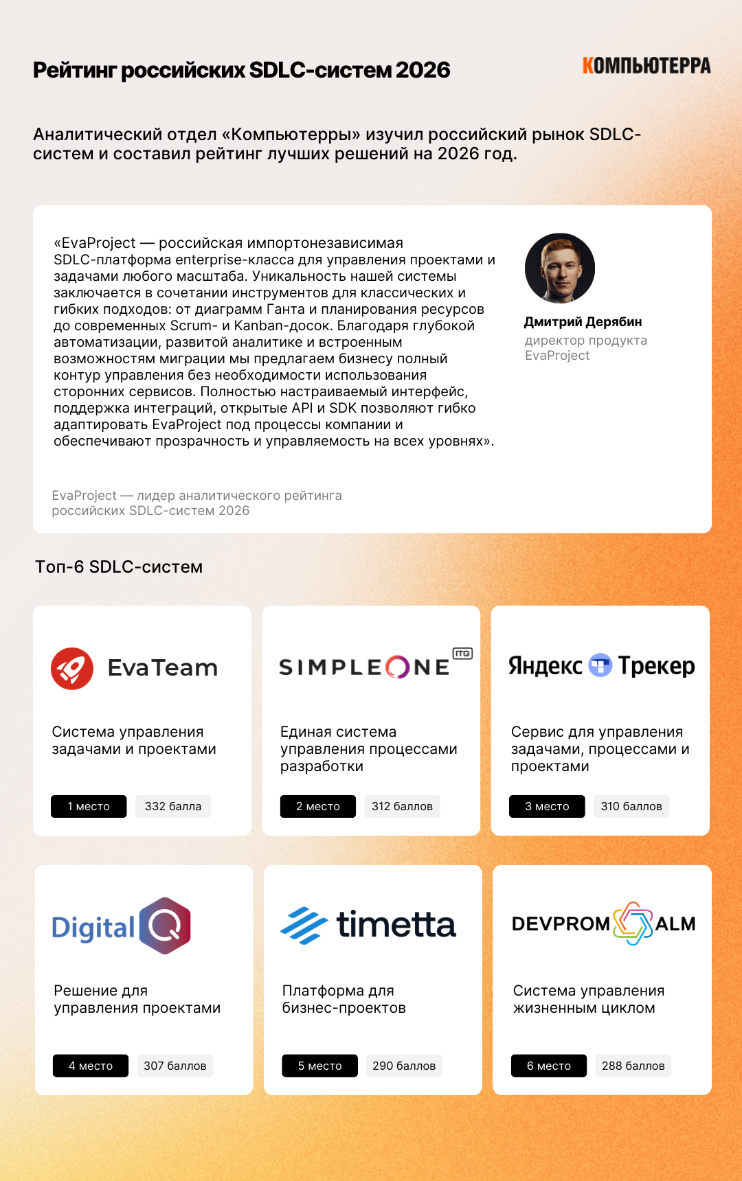 Лидером рейтинга российских SDLC-систем стала платформа EvaProject от компании EvaTeam, набрав 332 балла.