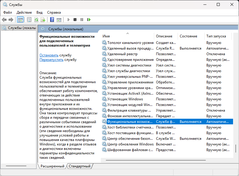 - Найдите службу «Функциональные возможности для подключенных пользователей и телеметрия»;