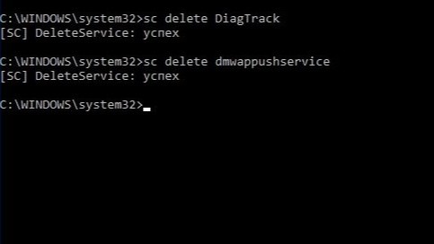 - Вводим сначала «sc delete DiagTrack», в затем «sc delete dmwappushservice». Все без кавычек.